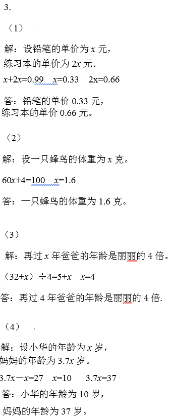 (1)李红买了一支铅笔和一个练习本,一共花了0.99元,练习本的单价是铅笔的2倍,铅笔和练习本的单价各是多少元?