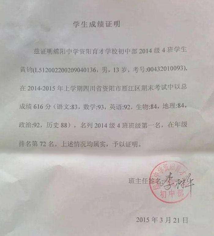 就读于四川省资阳市绵阳中学育才学校,于2014年9月报名清大名师网学习,并在2015年考取班级第一名。