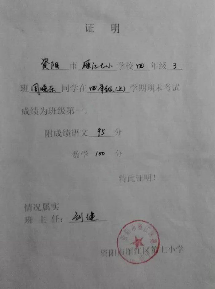 就读于资阳市雁江县第七小学,于