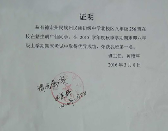 祝贺云南省德宏州胡广仙同学考取班级第一名