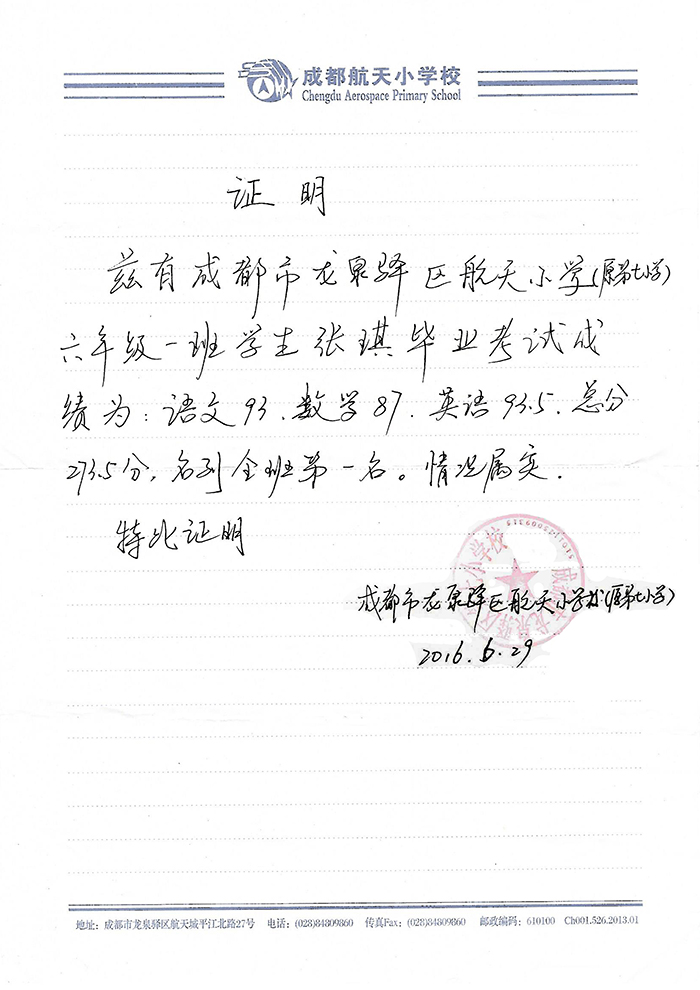 祝贺成都市龙泉驿区张琪同学考取班级第一名