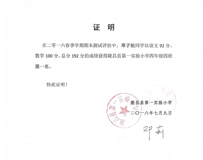 祝贺四名川省内江市隆昌县邓子恒同学考取班级第一