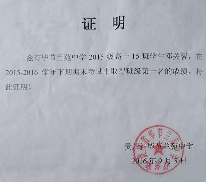 祝贺贵州省毕节市邓关蓉同学考取班级第一名