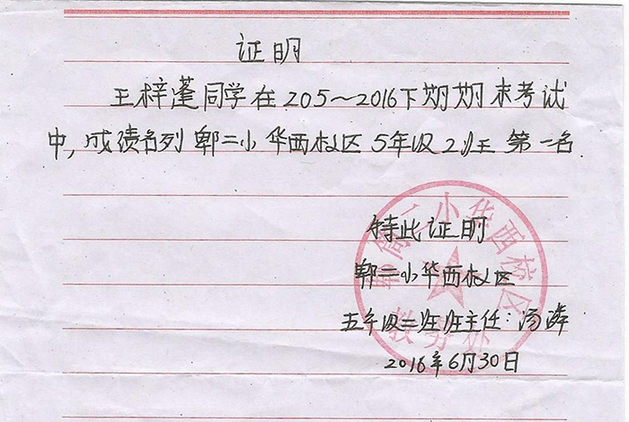2016上学年期末考试中考取班级第一名。在2017