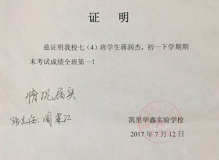 祝贺贵州省黔东南州蒋润杰同学考取班级第一名
