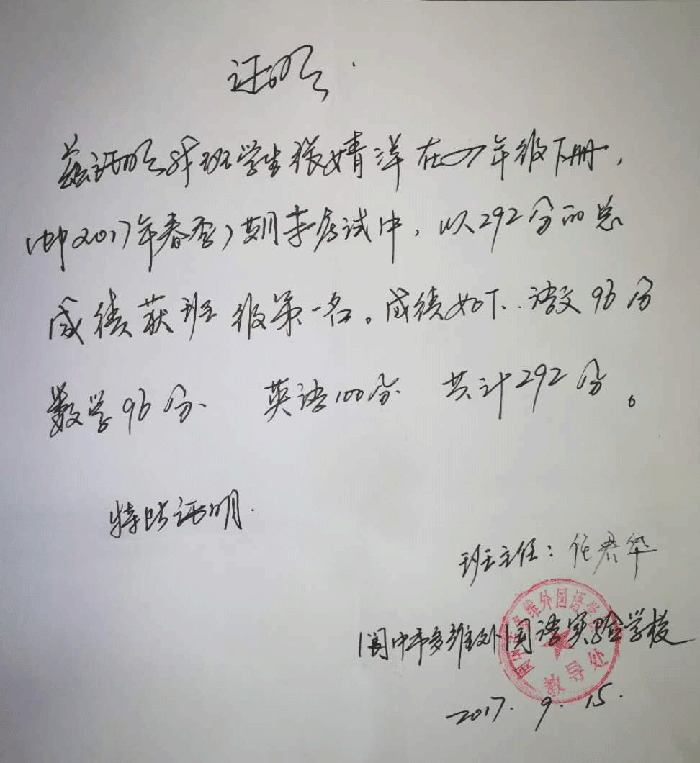 祝贺四川省阆中市张婧洋同学考取班级第一名