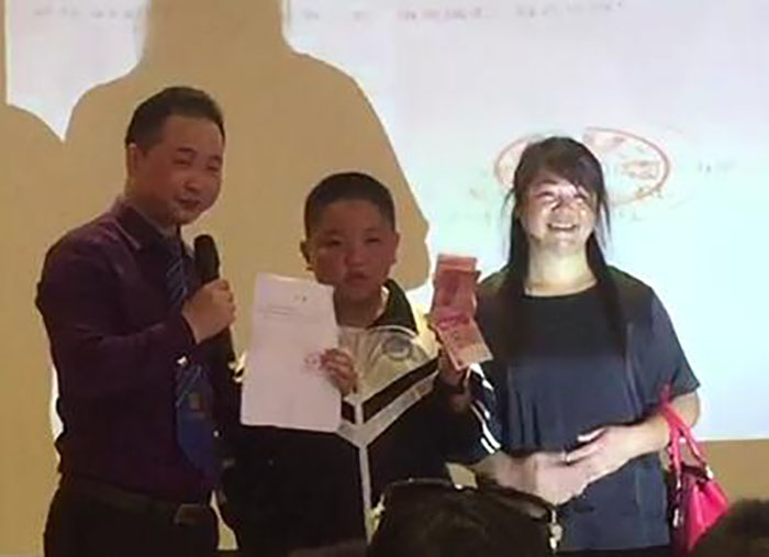 老师为其颁发奖学金。