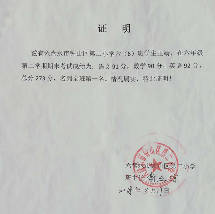 祝贺贵州省六盘水市王靖同学考取班级第一名
