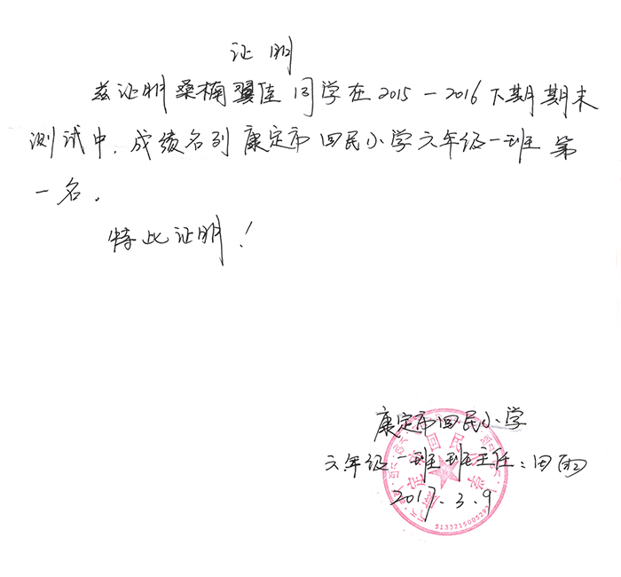 祝贺四川省甘孜藏族自治州康定市桑楠翼佳同学考取班级第一名
