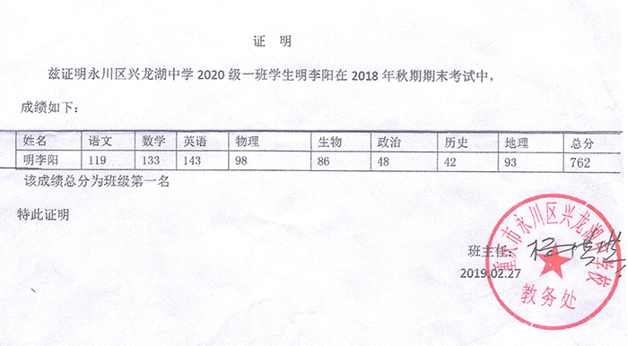 清大名师网校成果:祝贺重庆市永川区明李阳同学考取班级第一名