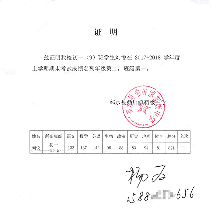 祝贺四川省广安市邻水县刘悦同学考取班级第一名