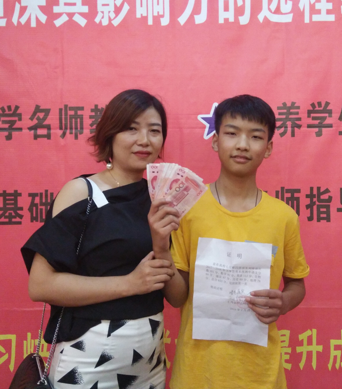 老师为其颁发奖学金。