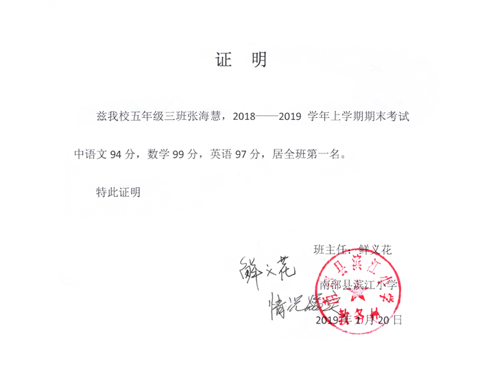 祝贺四川省南充市南部县张海慧同学考取班级第一名