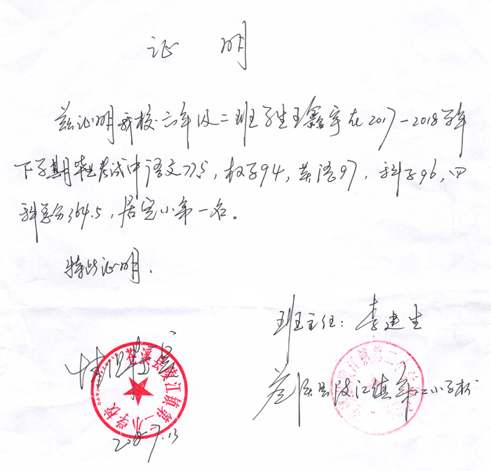 祝贺四川省广元市苍溪县王鑫宇同学考取年级第一名