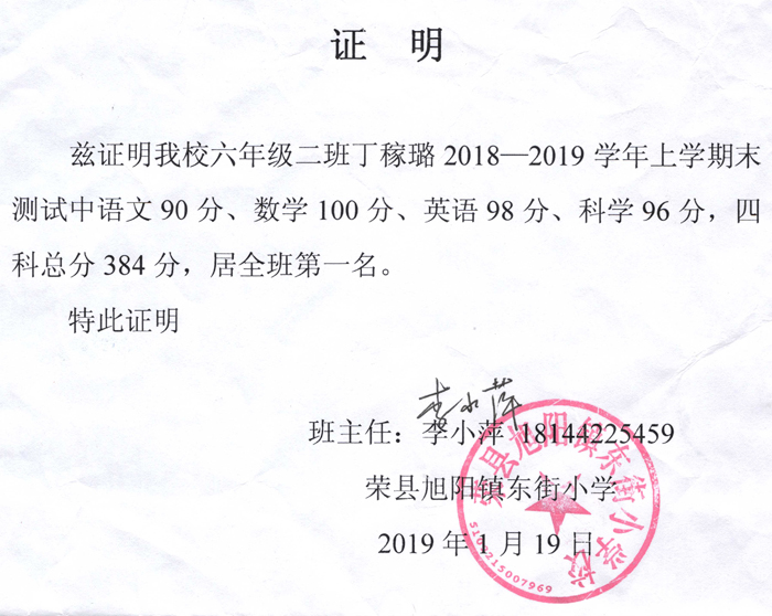 祝贺四川省自贡市荣县丁稼璐同学考取班级第一名