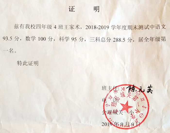 祝贺四川省凉山州会理县王家术同学考取年级第一名