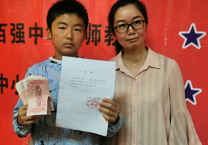 老师为其颁发奖学金。