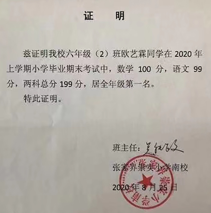 祝贺湖南省张家界市欧艺霖同学考取年级第一名